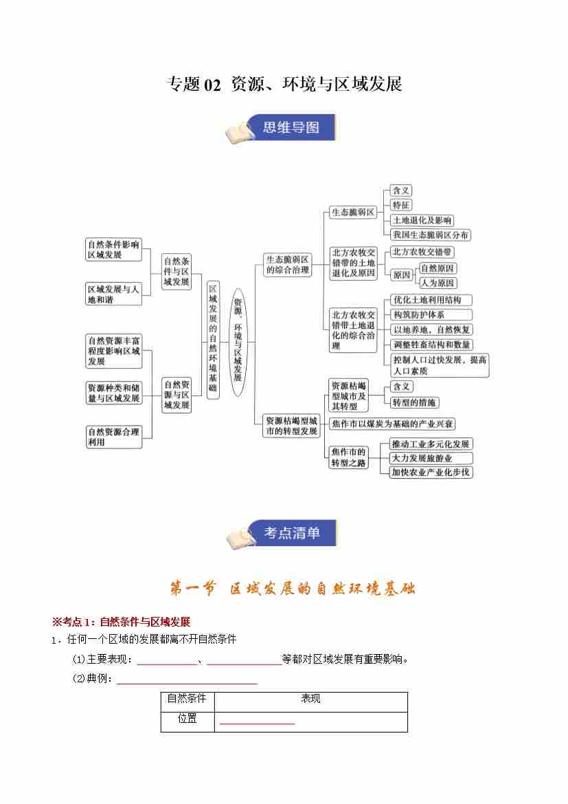 选修一地理专题02 资源、环境与区域发展(期末复习知识清单)(挖空版)