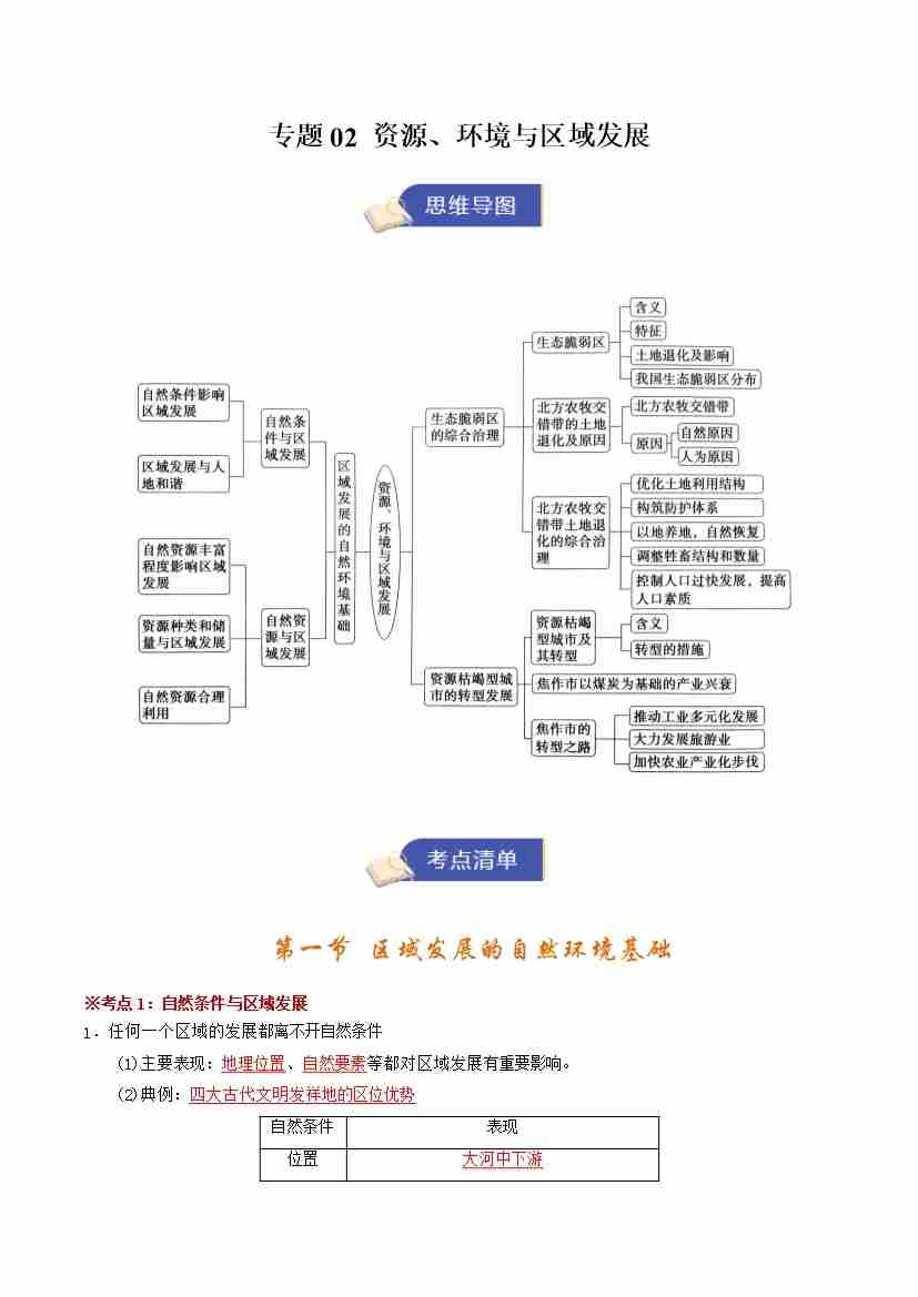 选修一地理专题02 资源、环境与区域发展(期末复习知识清单)(教师版)