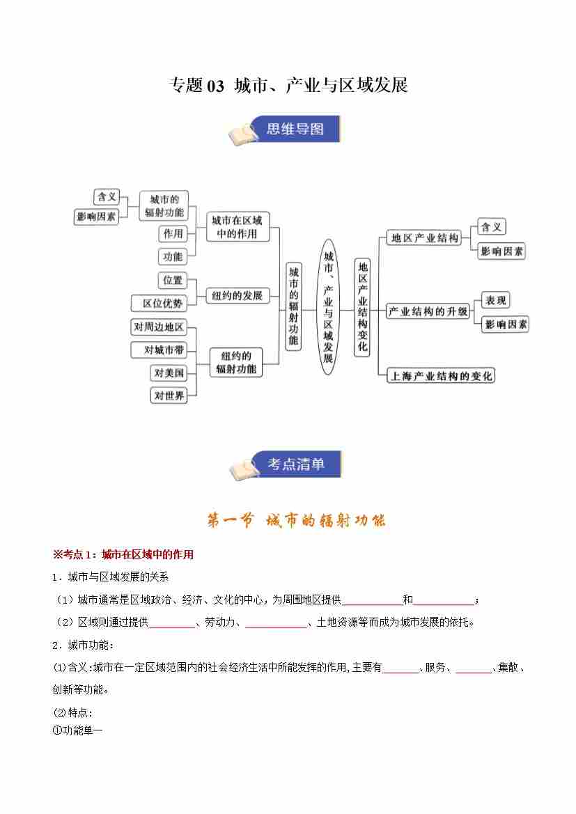 选修一地理专题03 城市、产业与区域发展(期末复习知识清单)(挖空版)