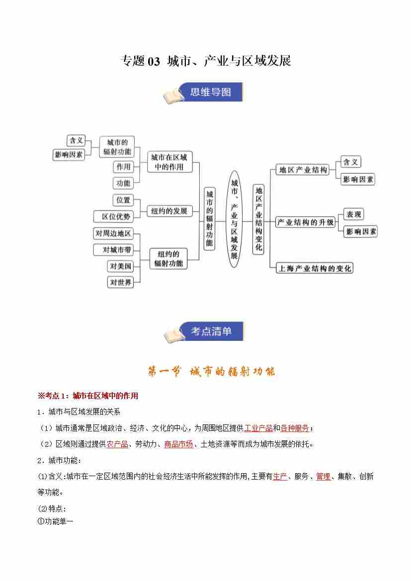 选修一地理专题03 城市、产业与区域发展(期末复习知识清单)(教师版)