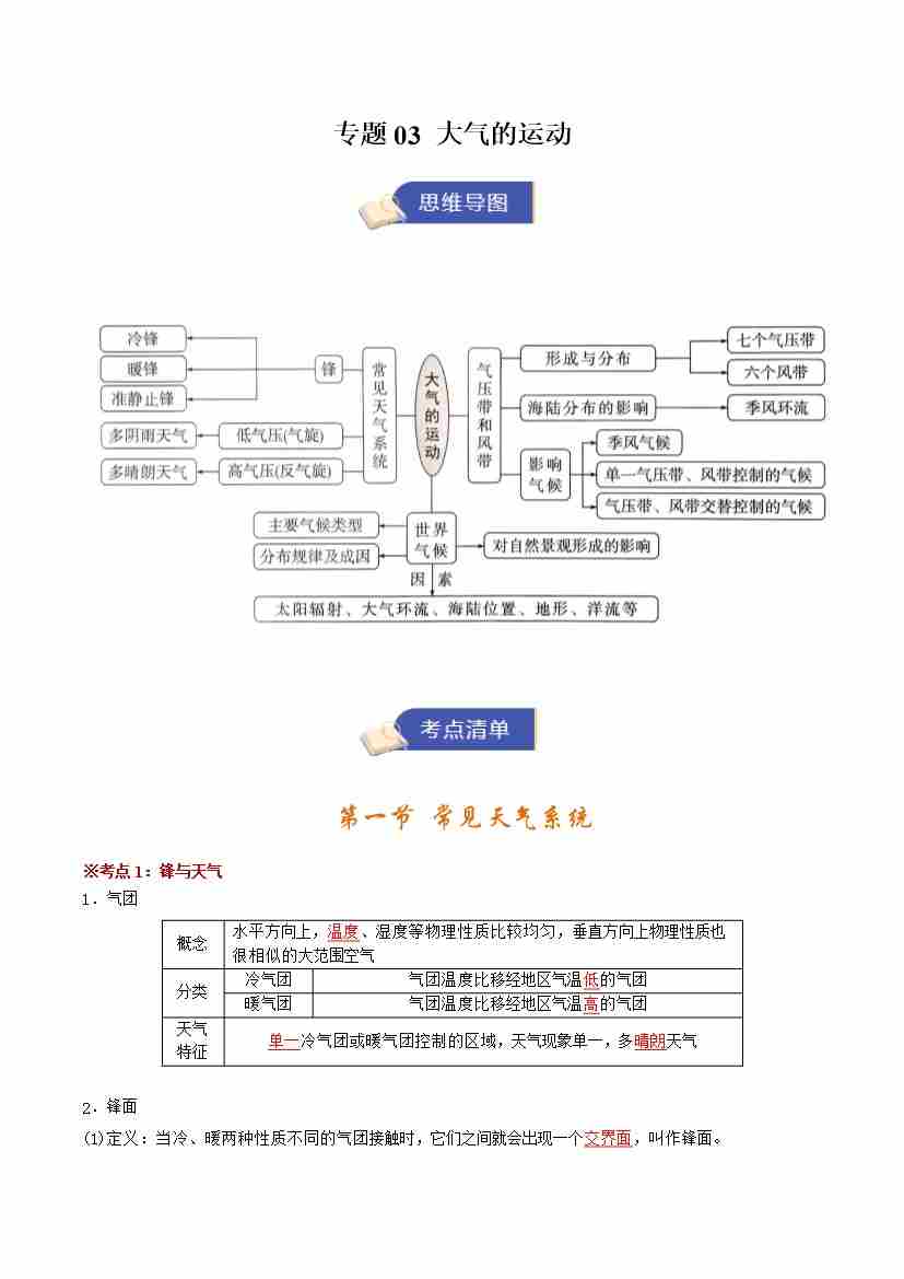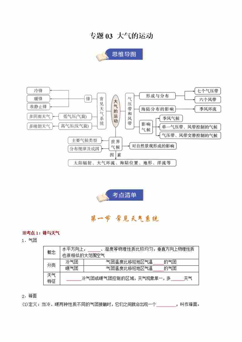 选修一地理专题03 大气的运动(期末复习知识清单)(挖空版)