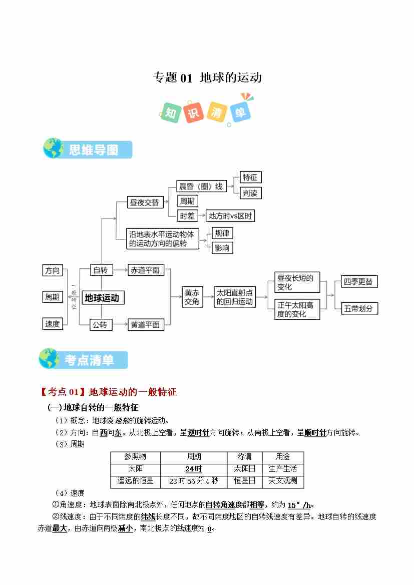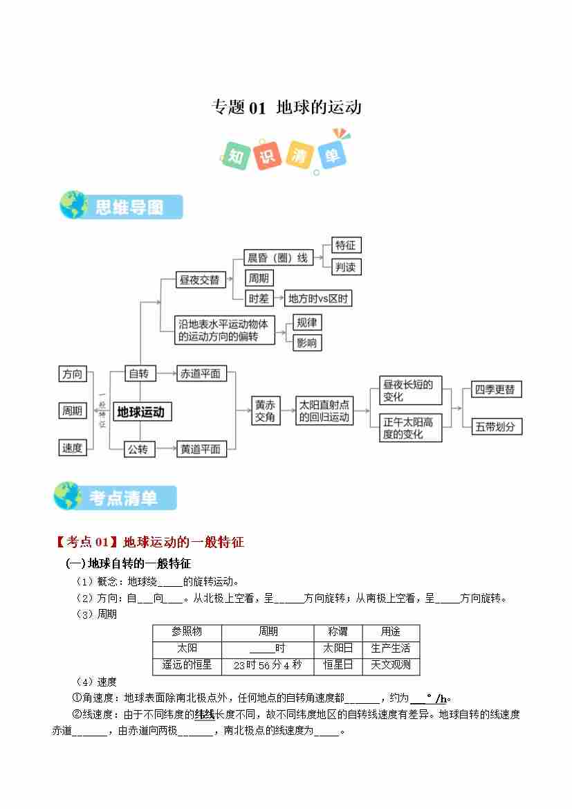 选必1 第一章 地球运动(期中知识清单)(学生版)