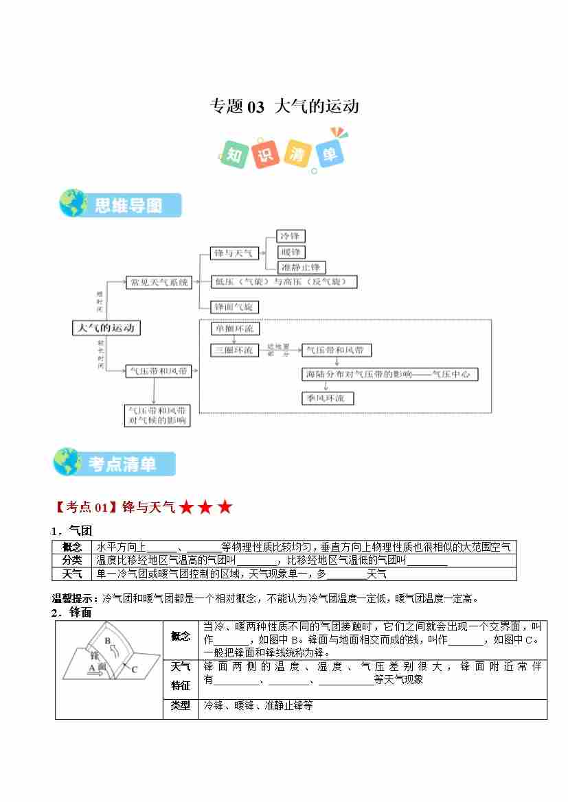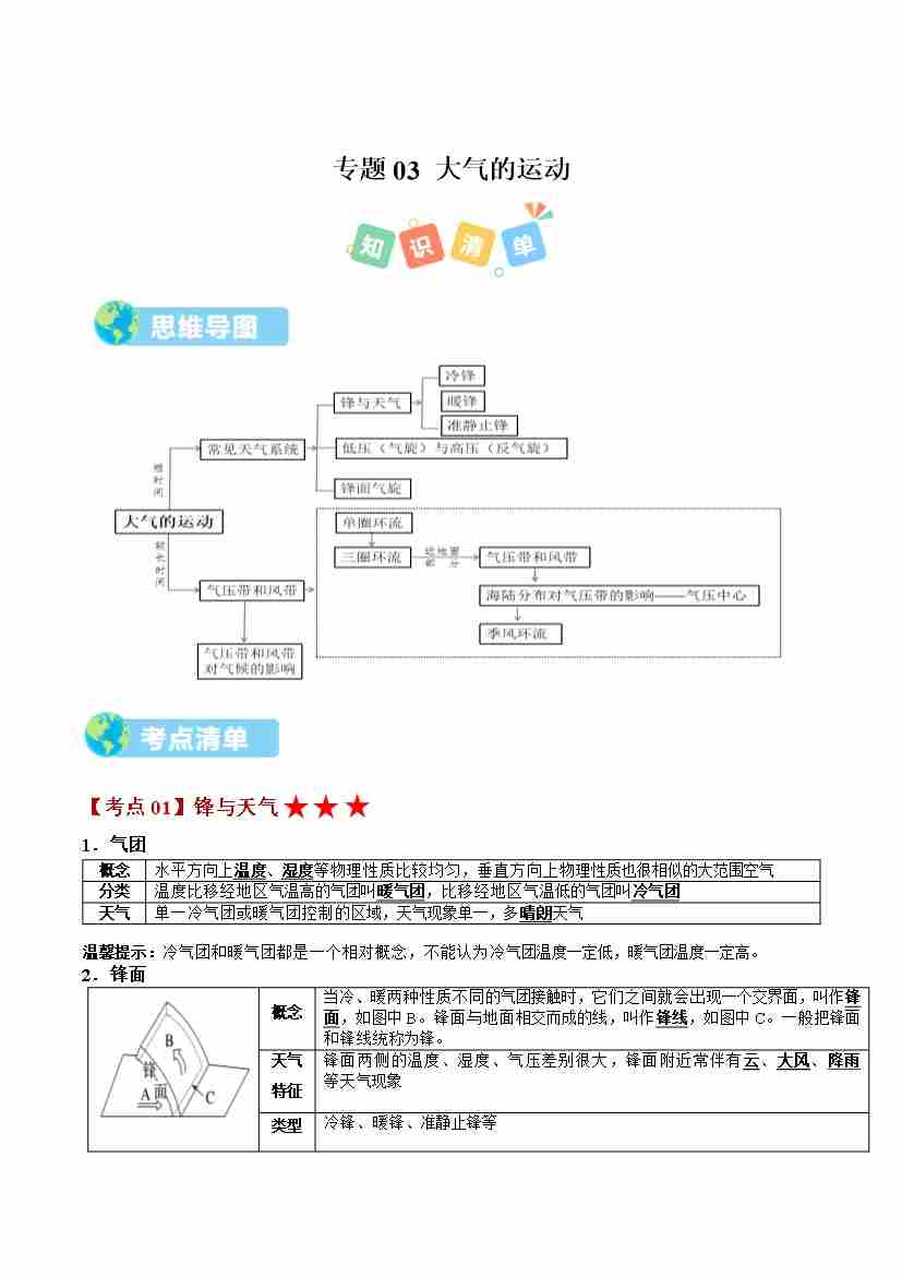 选必1 第三章 大气的运动(期中知识清单)(学生版)