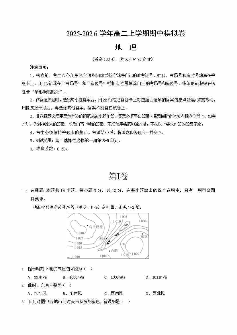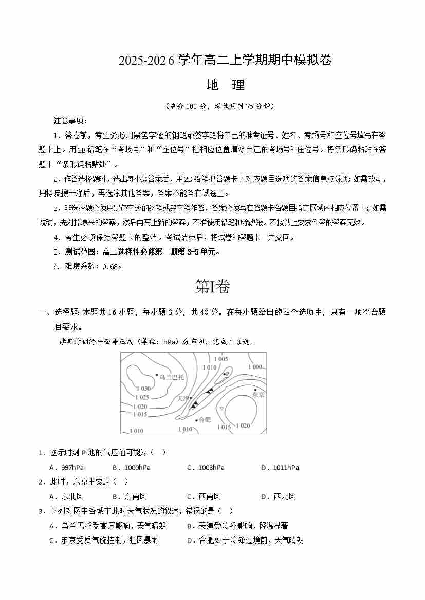 高二地理上学期(人教版选必1,3-5单元)期中模拟卷A(人教版2019)(考试版A4)