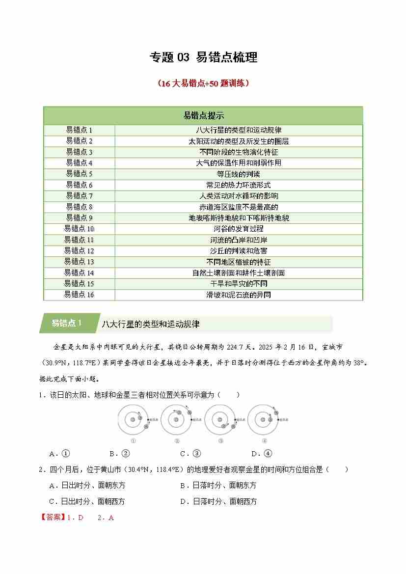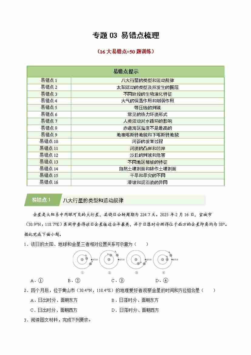 必修一地理专题03 易错点梳理(期末专项训练)(原卷版)