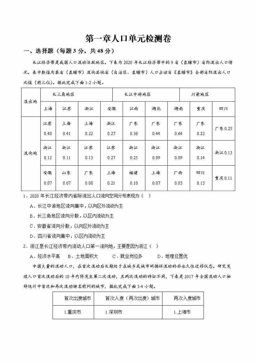 第一章人口综合检测卷(原卷版)