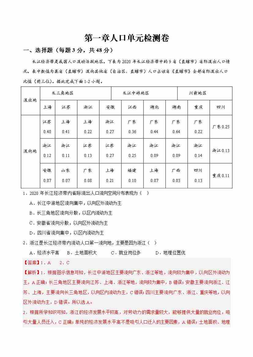 第一章人口综合检测卷(解析版)