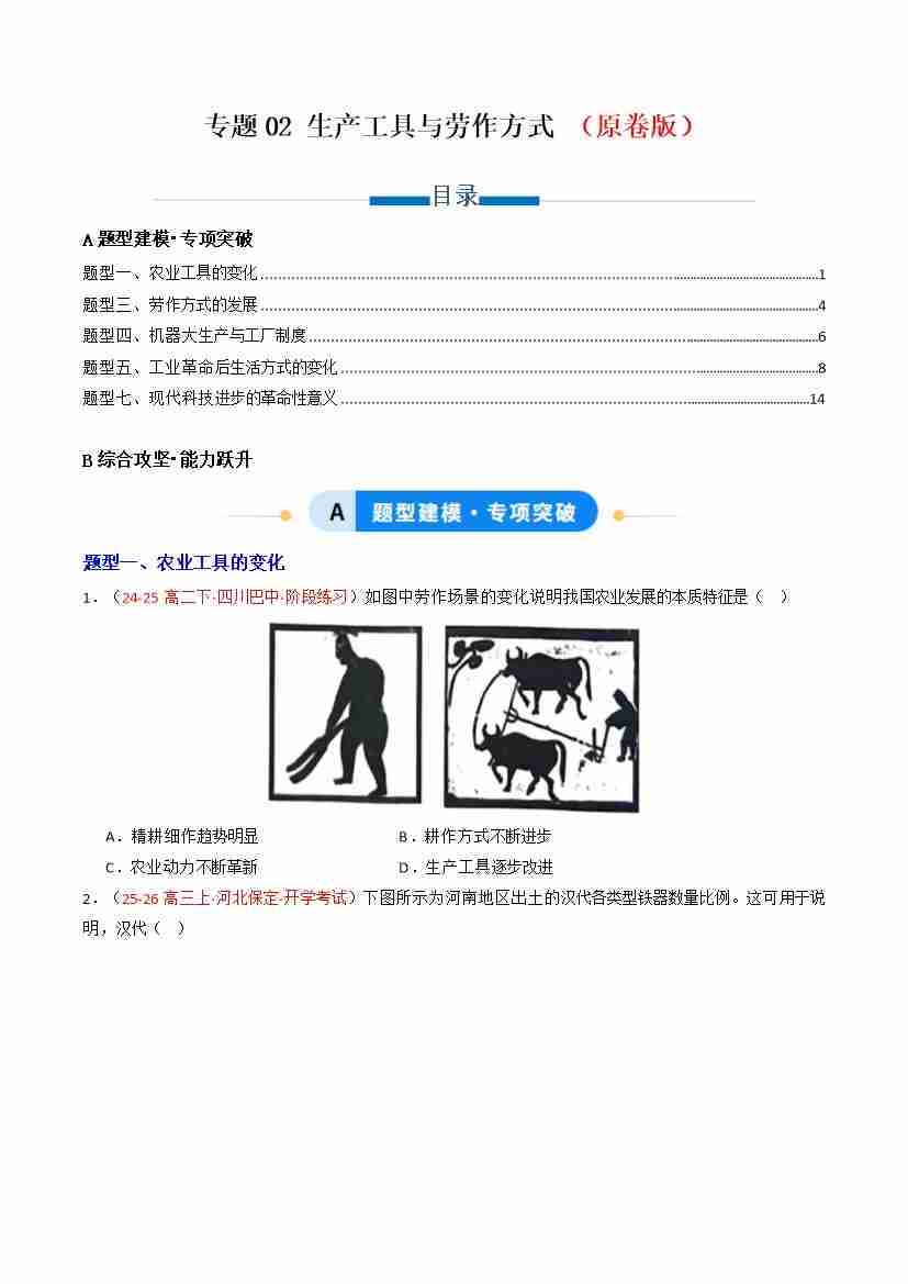 专题02 生产工具与劳作方式 (原卷版)(专项训练)