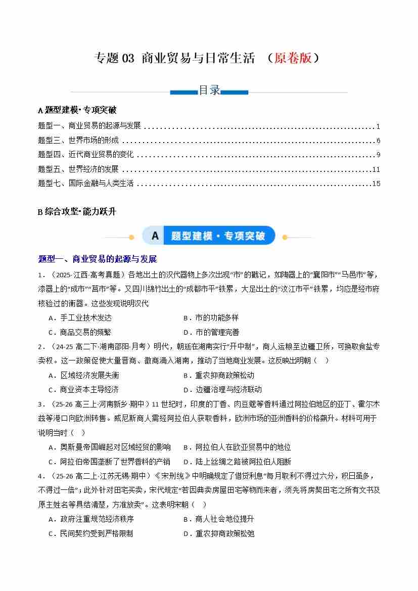 专题03 商业贸易与日常生活(原卷版)(专项训练)