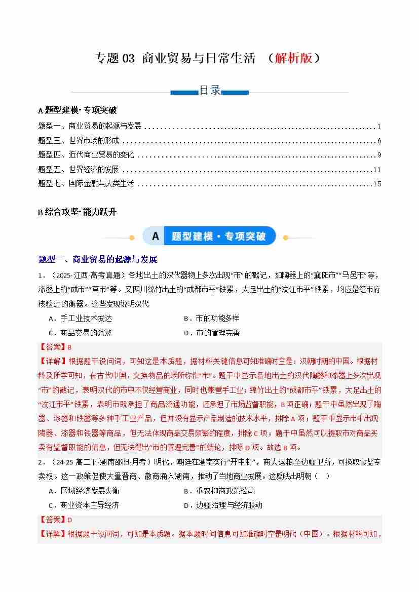 专题03 商业贸易与日常生活(解析版)(专项训练)