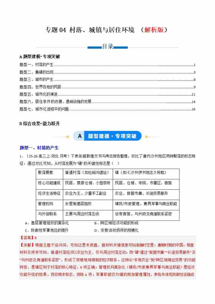 专题04 村落、城镇与居住环境(解析版)(专项训练)