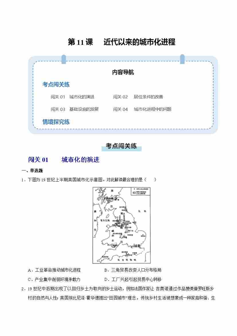 第11课 近代以来的城市化进程(情境化作业)(原卷版)