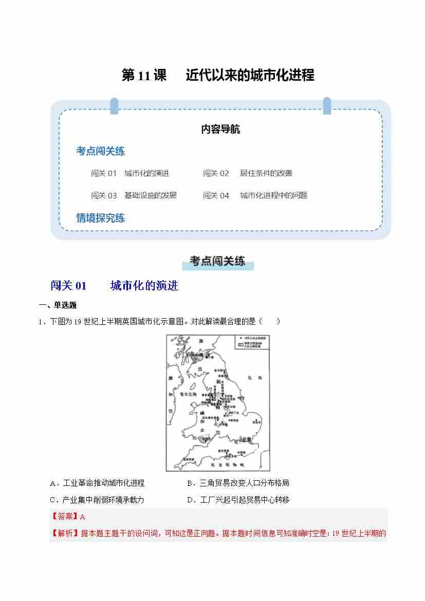 第11课 近代以来的城市化进程(情境化作业)(解析版)