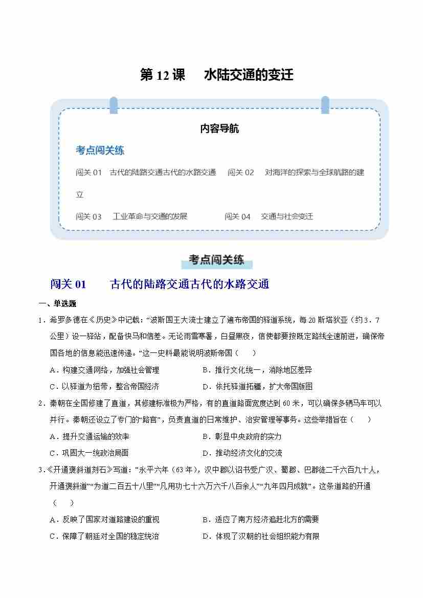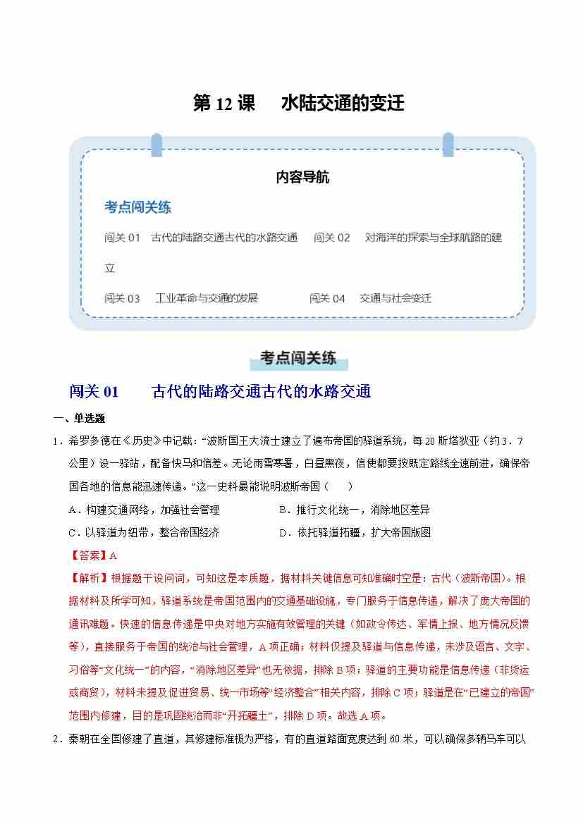 第12课 水陆交通的变迁(情境化作业)(解析版)