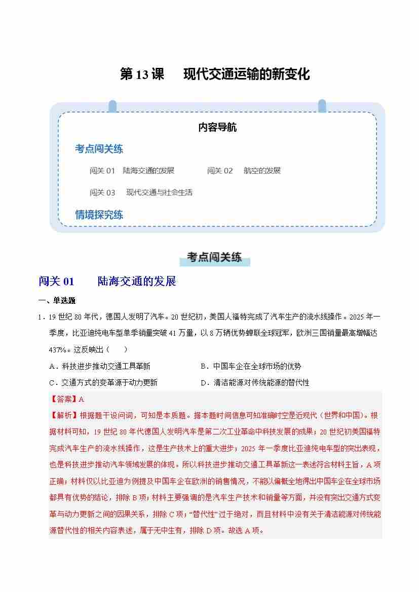 第13课 现代交通运输的新变化(情境化作业)(解析版)