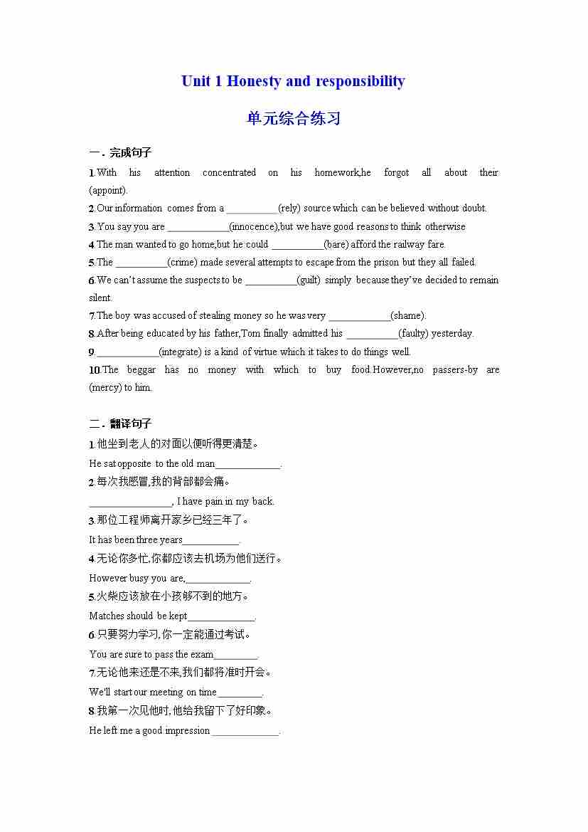 Unit 1 Honesty and responsibility 单元综合练习 (原卷版)(译林版2020选择性必修第四册)