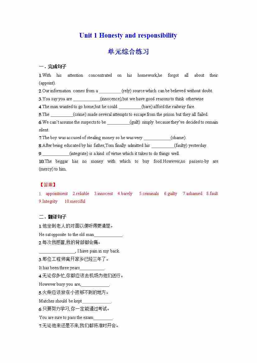 选择性必修第四册 Unit1 Honesty and responsibility(教师版)