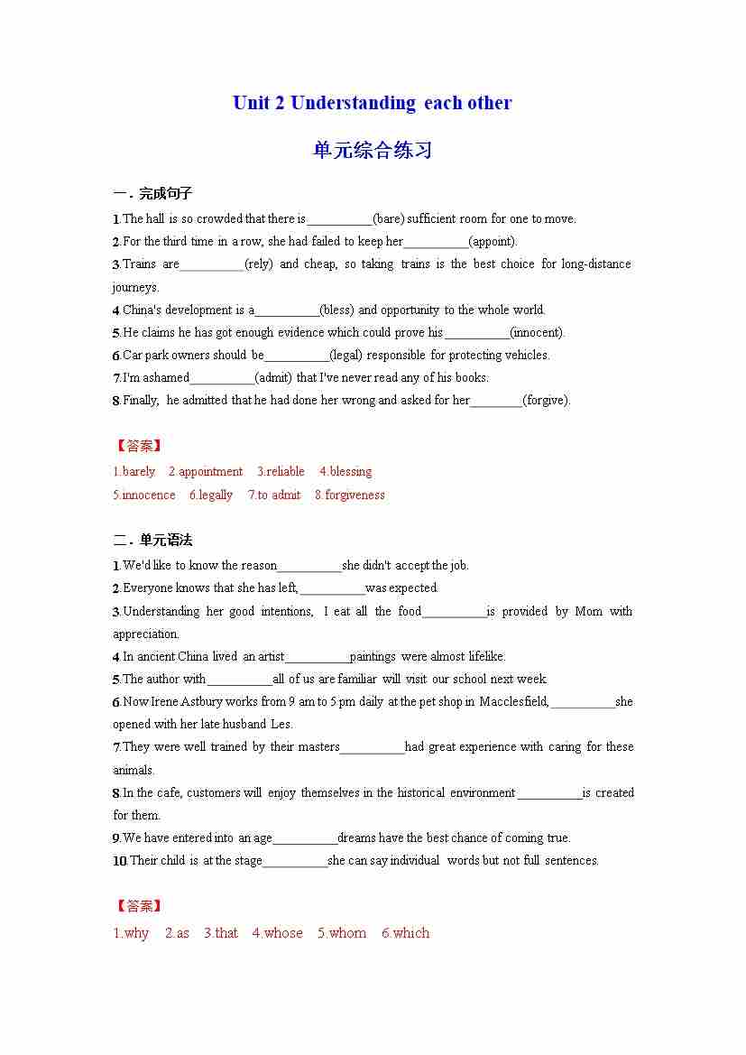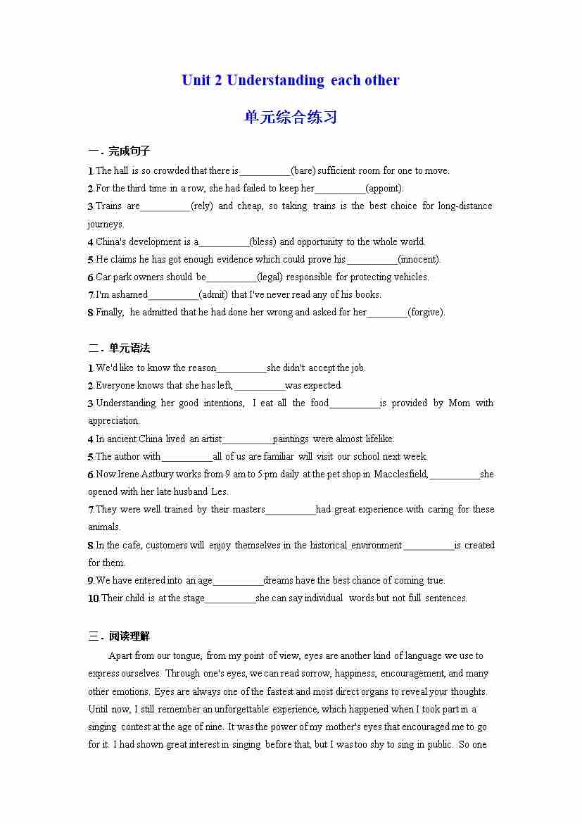 Unit 2 Understanding each other 单元综合练习 (原卷版)