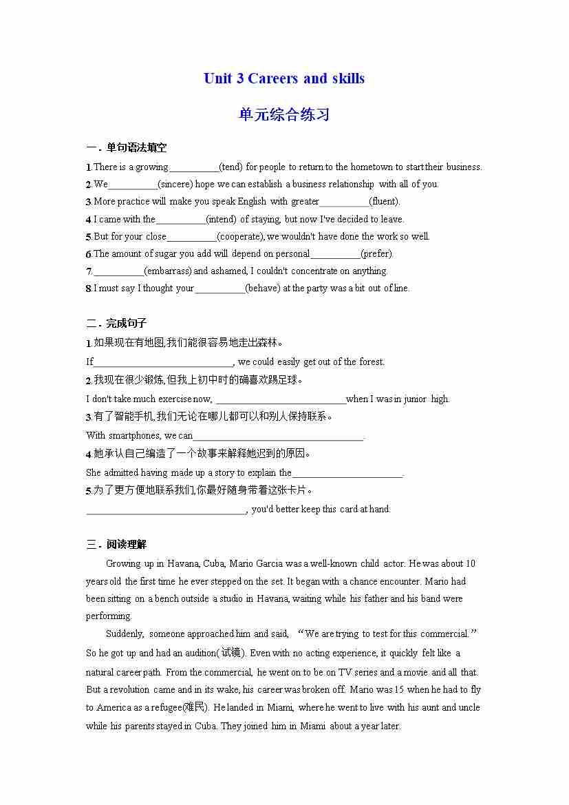 Unit 3 Careers and skills 单元综合练习 (原卷版)(译林版2020选择性必修第四册)