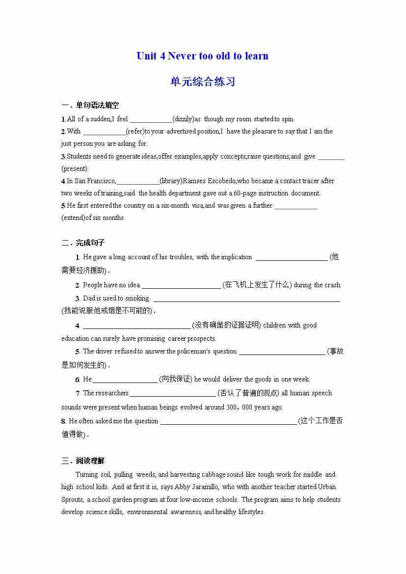 Unit 4 Never too old to learn 单元综合练习 (原卷版)