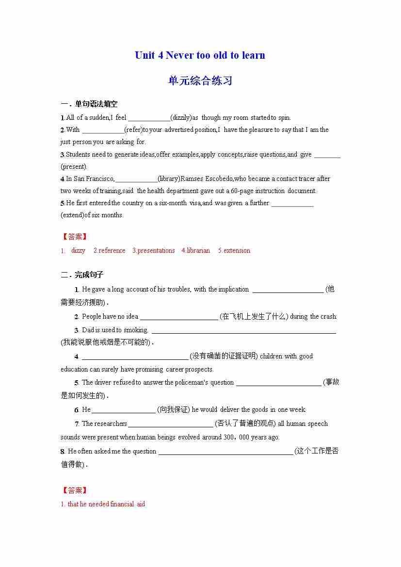 Unit 4 Never too old to learn 单元综合练习 (解析版)