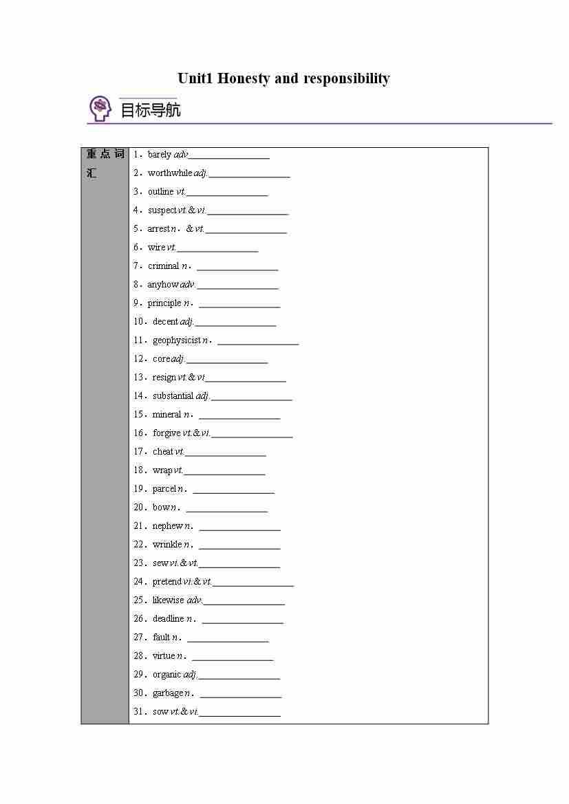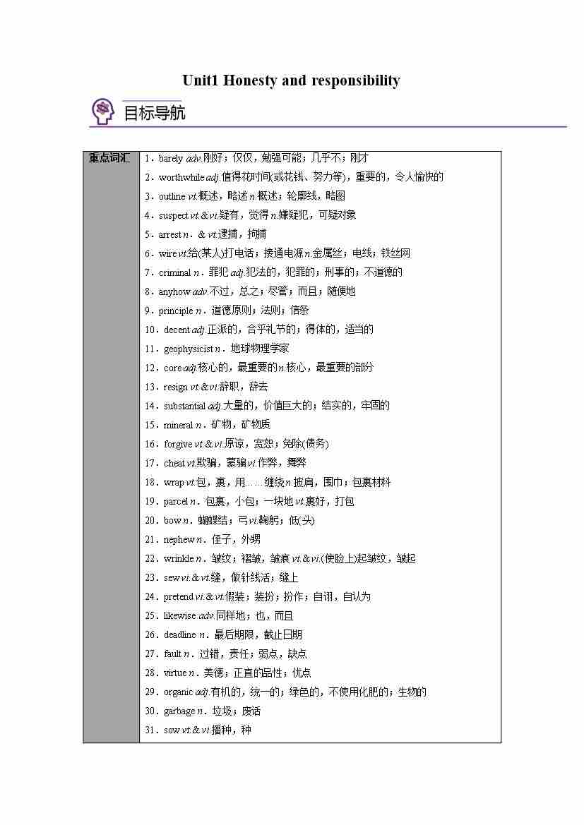 选择性必修第四册 Unit1 Honesty and responsibility(学生版)