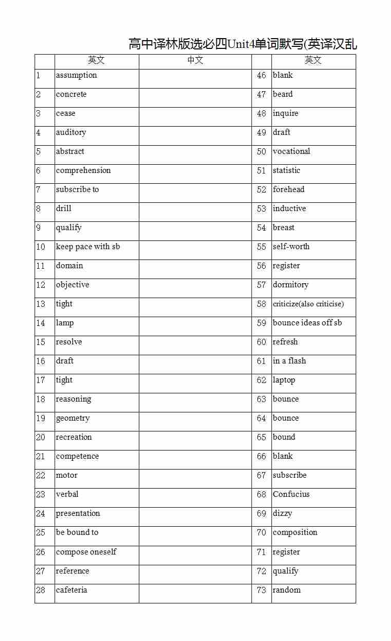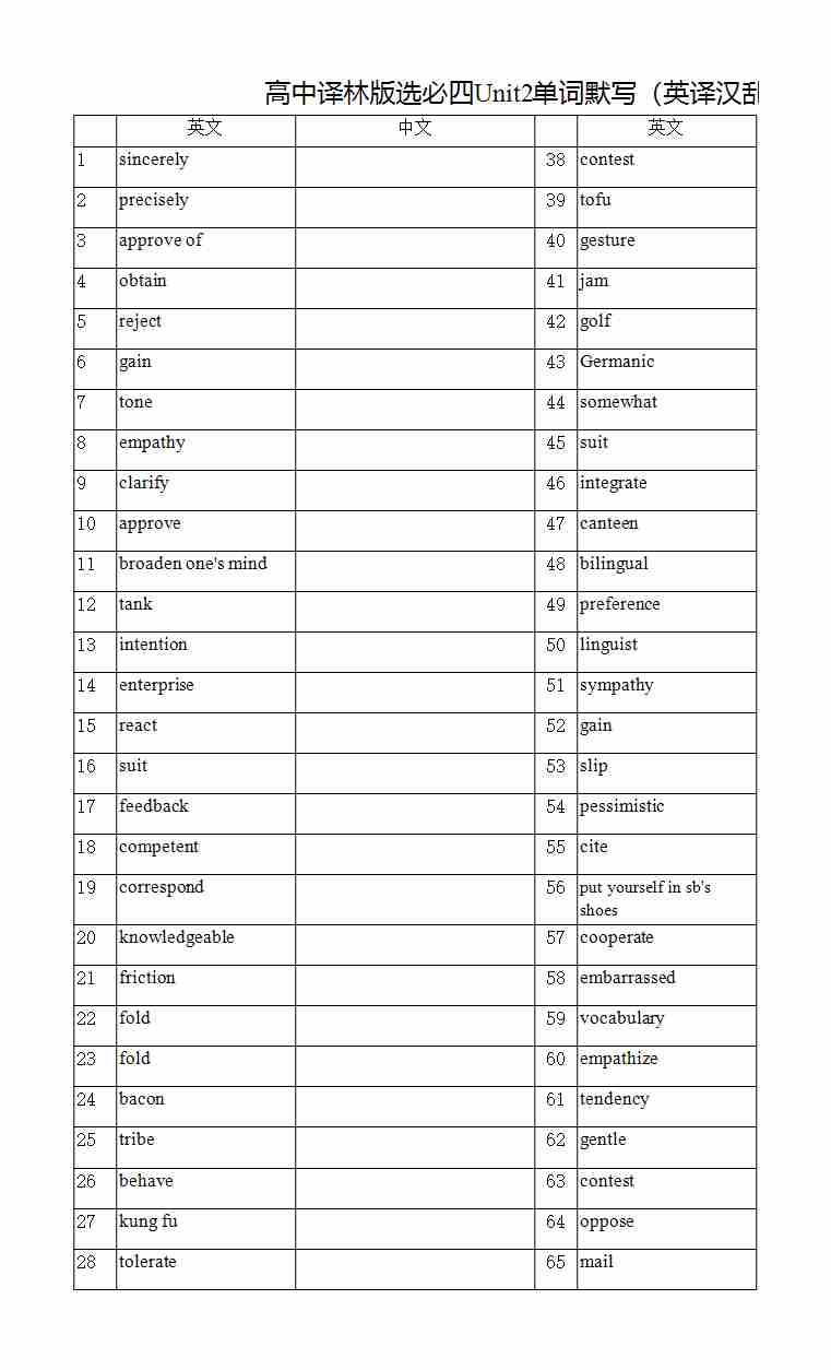 高中译林版选必四Unit2单词默写(英译汉乱序)