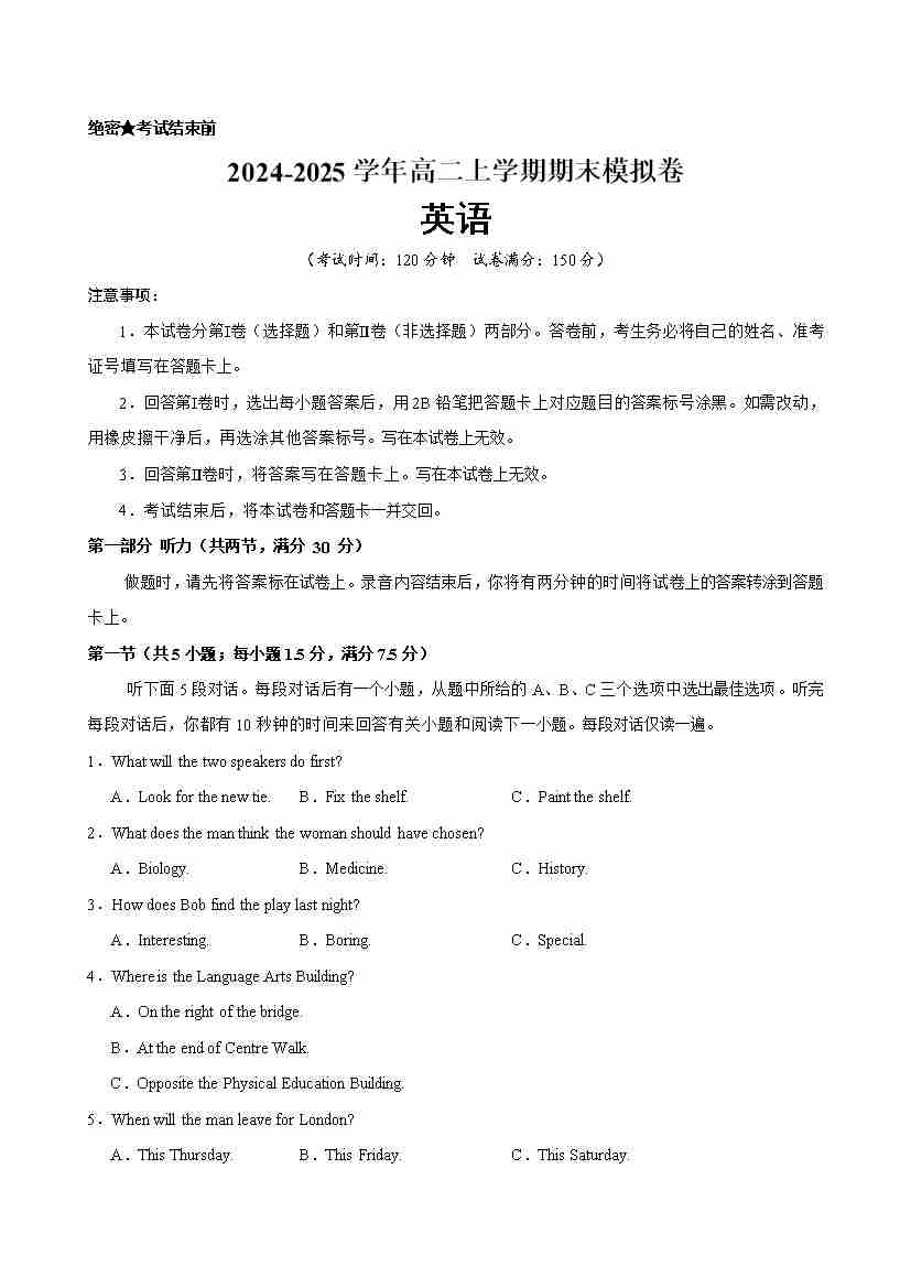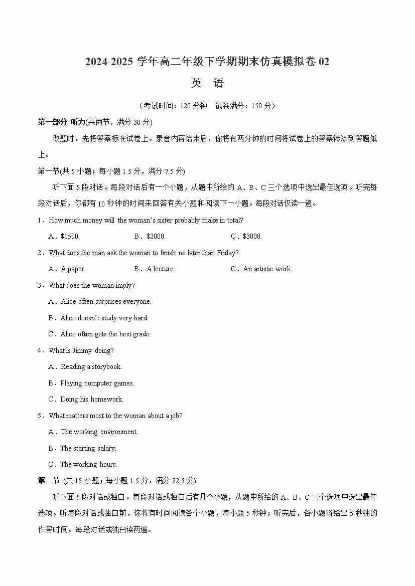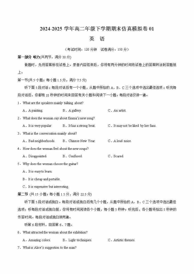 高二下学期期末英语仿真模拟卷01 (学生版)