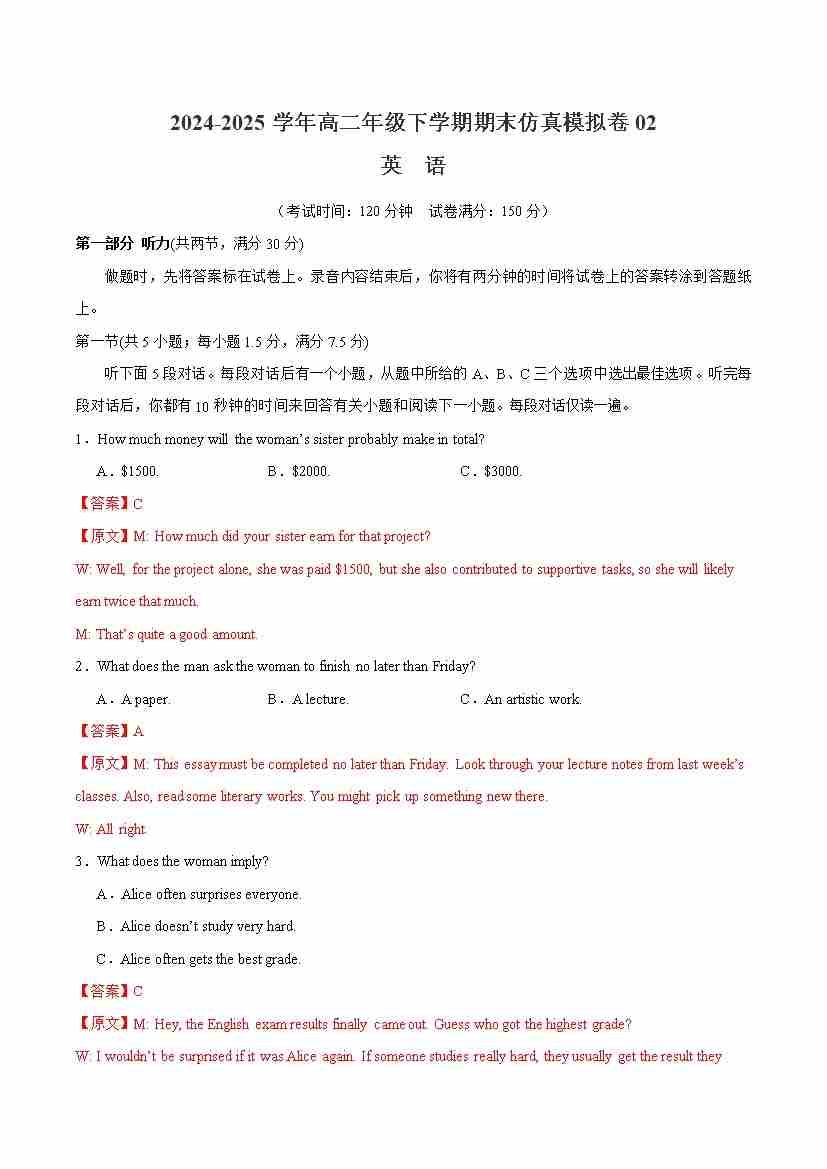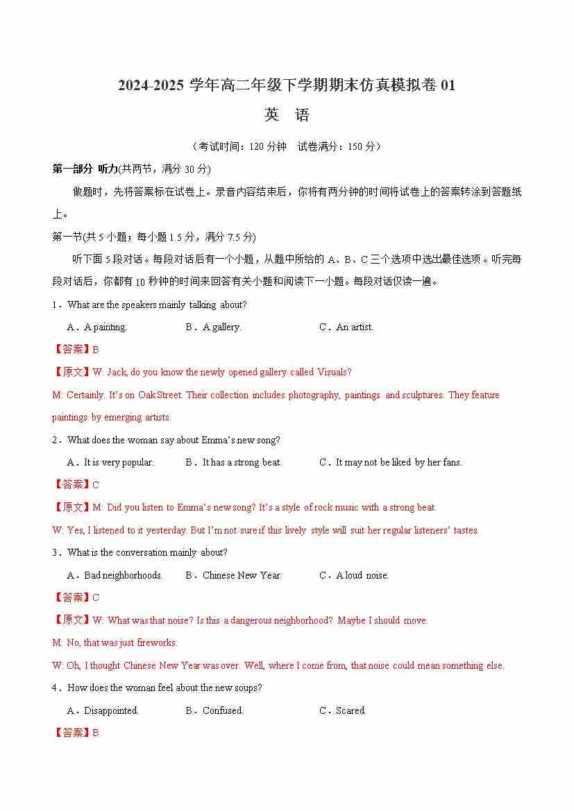 高二下学期期末英语仿真模拟卷01 (教师版)