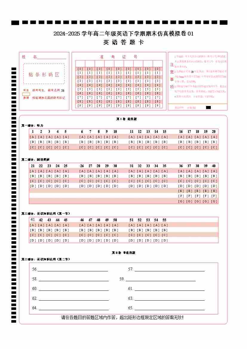 高二下学期期末英语仿真模拟卷01(答题卡)