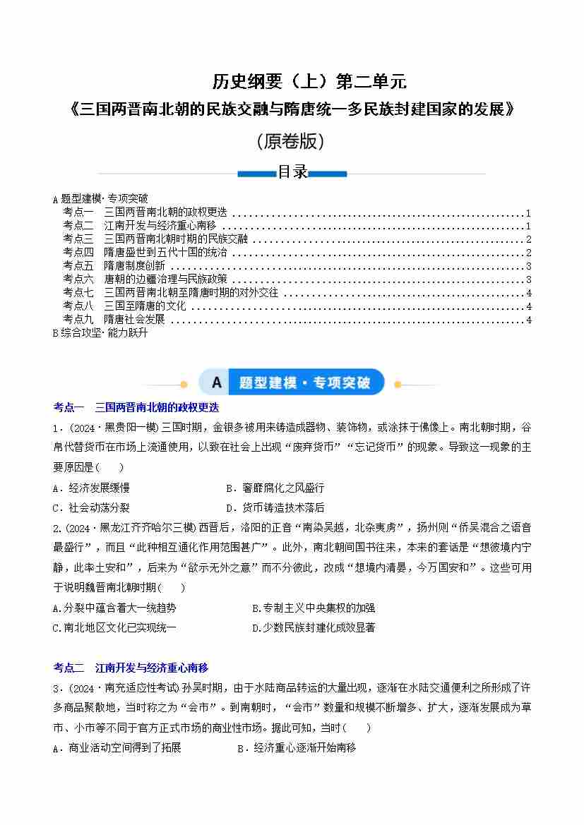 第二单元 三国两晋南北朝的民族交融与隋唐统一多民族封建国家的发展(专项训练)(学生版)