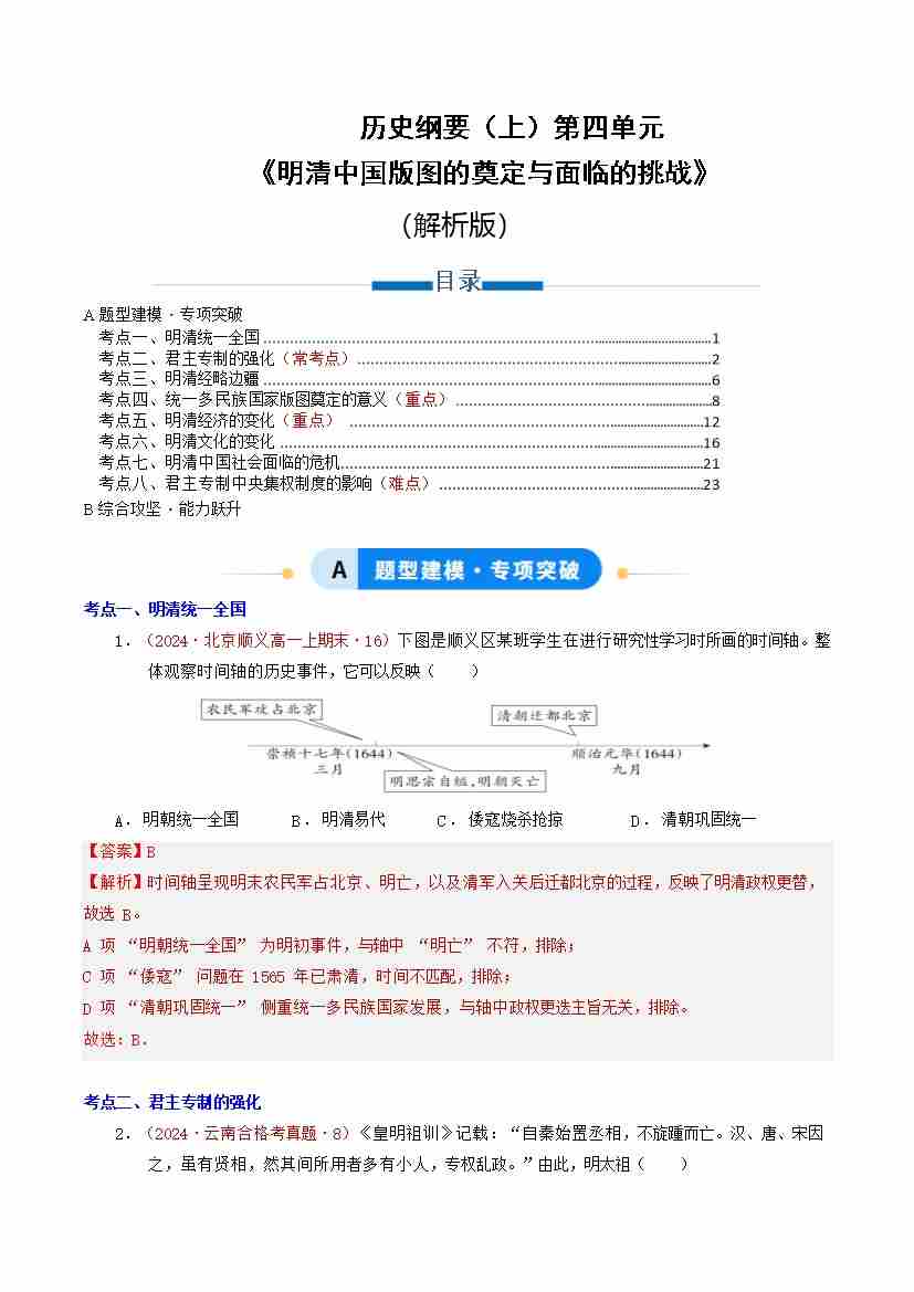 纲要上历史第四单元 明清中国版图的奠定与面临的挑战(专项训练)(教师版)