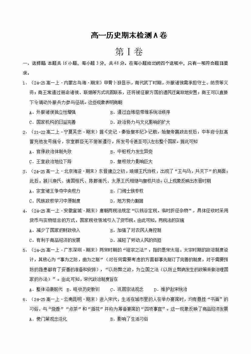 高一历史期末检测(A卷.中外历史纲要上)(原卷版)