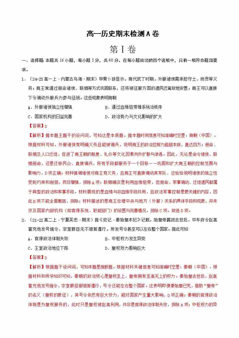高一历史期末检测(A卷.中外历史纲要上)(解析版)