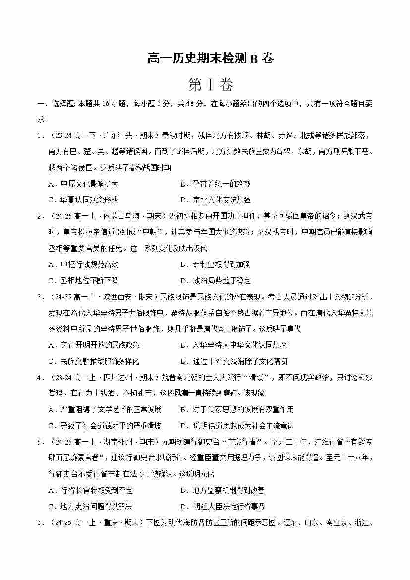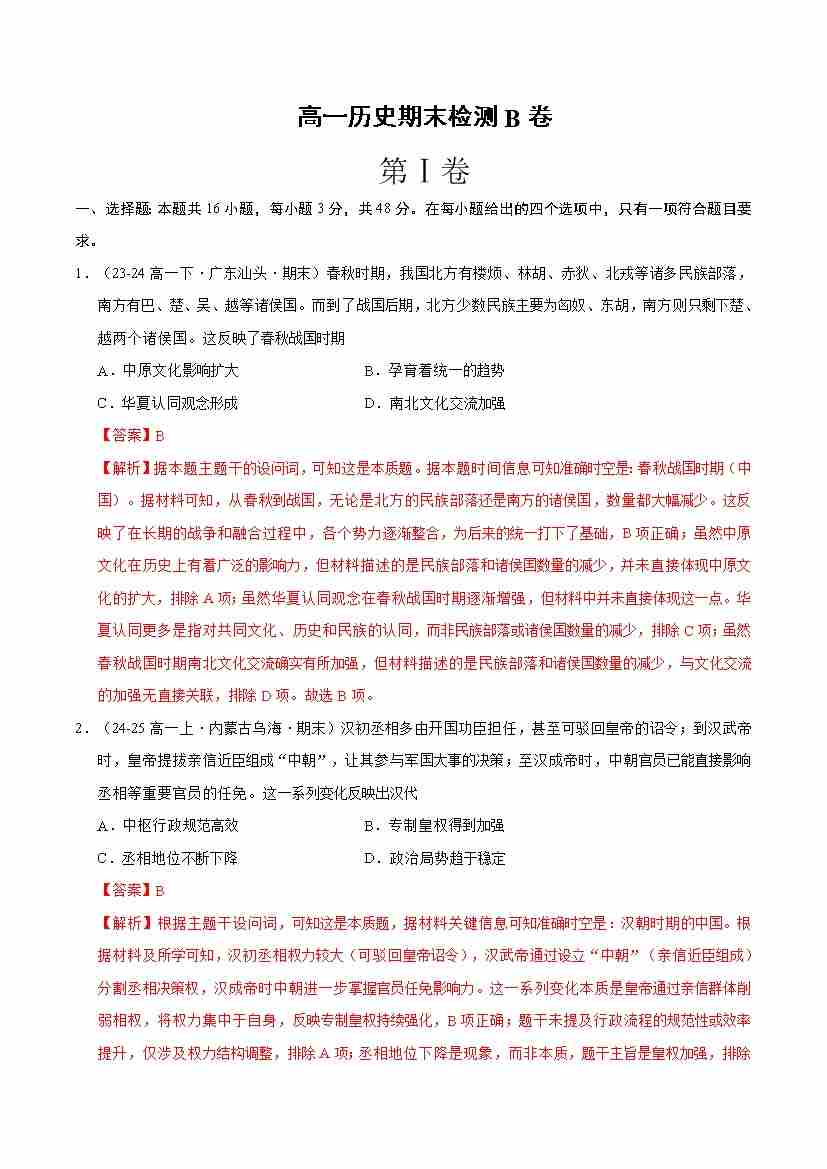 高一历史期末检测(B卷.中外历史纲要上)(原卷版)