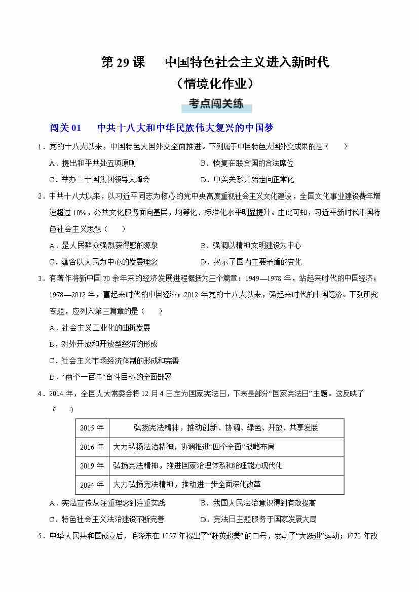 第29课 中国特色社会主义进入新时代(情境化作业)(原卷版)