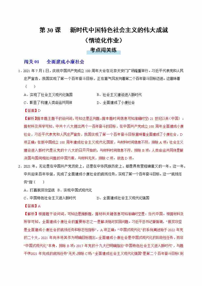 第30课 新时代中国特色社会主义的伟大成就(情境化作业)(解析版)