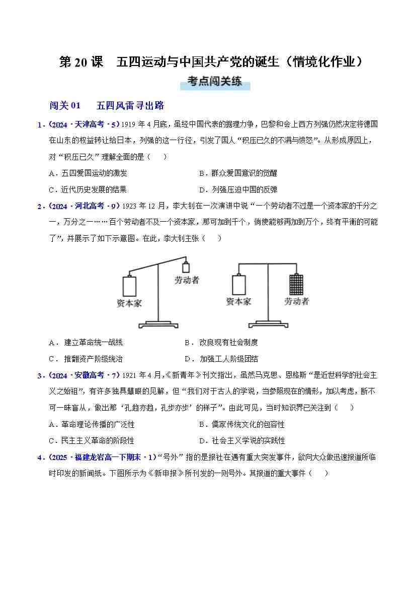 第20课 五四运动与中国共产党的诞生(情境化作业)(原卷版)