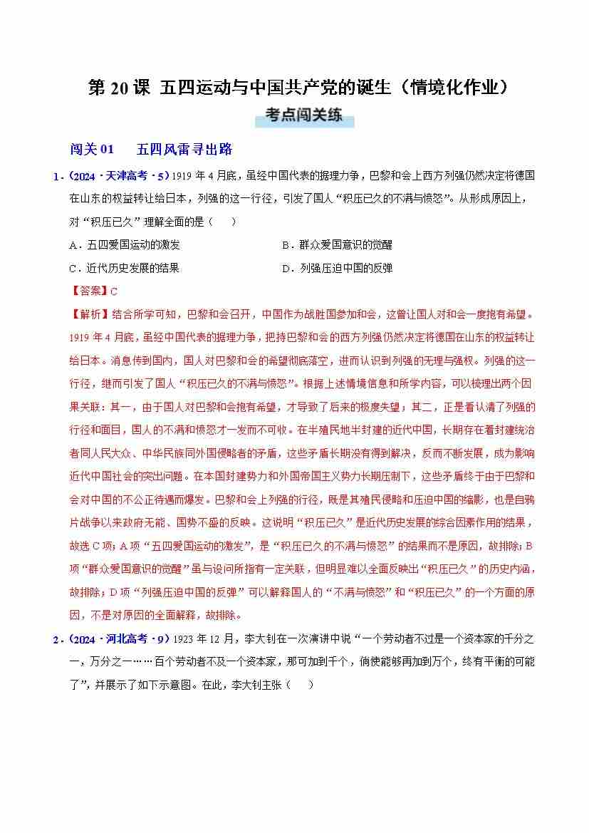 第20课 五四运动与中国共产党的诞生(情境化作业)(解析版)