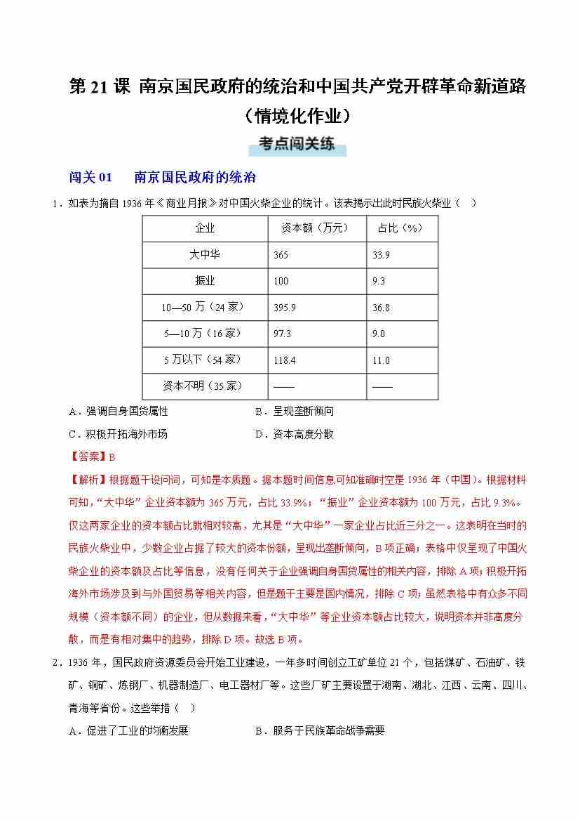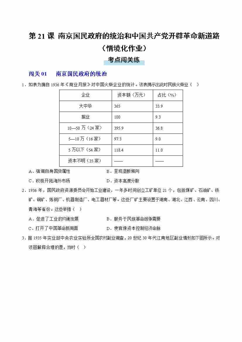 第21课 南京国民政府的统治和中国共产党开辟革命新道路(情境化作业)(解析版)