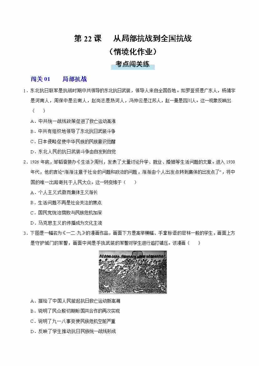 第22课 从局部抗战到全国抗战(情境化作业)(原卷版)