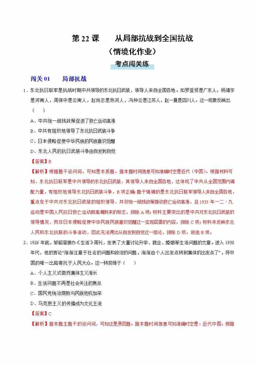 第22课 从局部抗战到全国抗战(情境化作业)(解析版)
