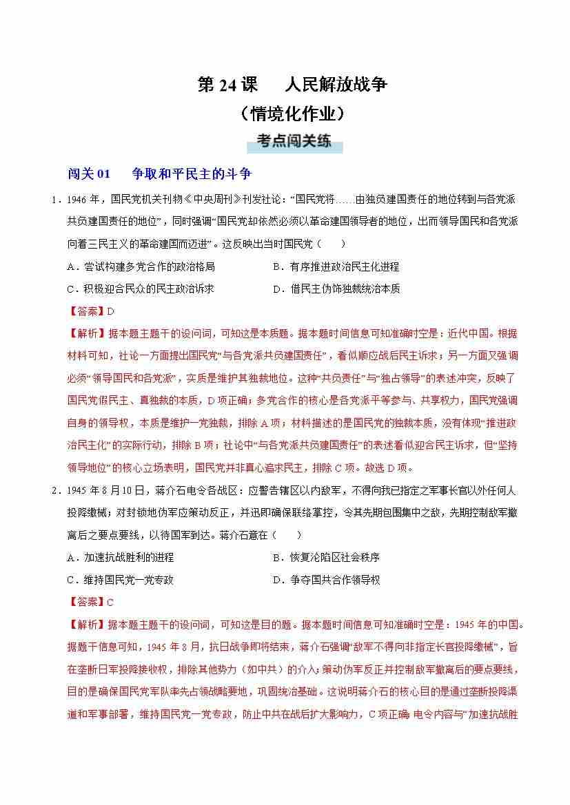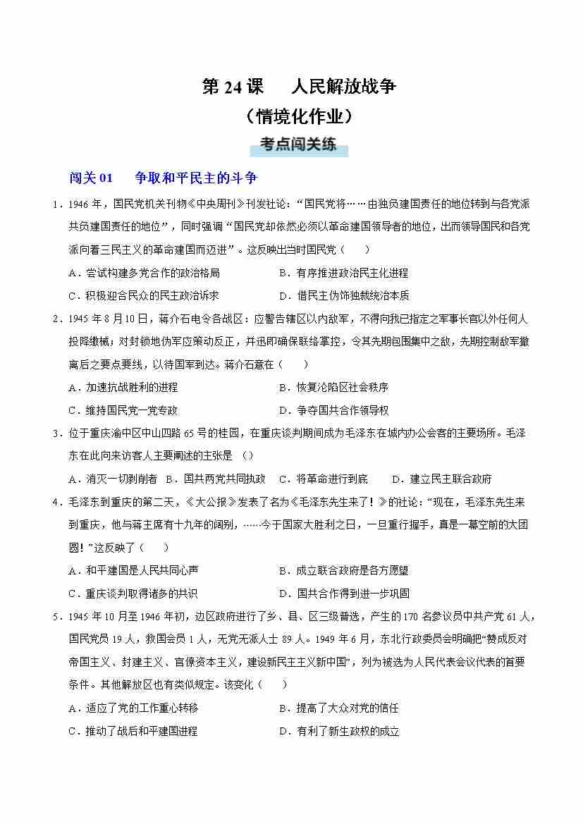 第24课 人民解放战争(情境化作业)(情境化作业)(解析版)