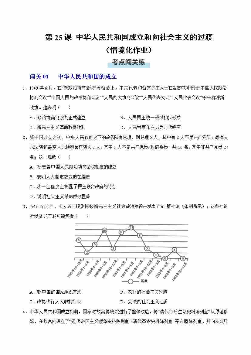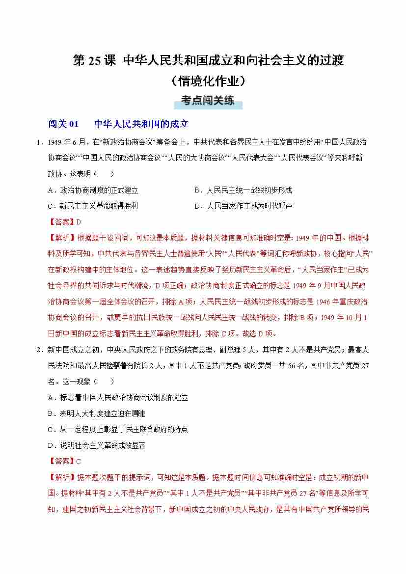 第25课 中华人民共和国成立和向社会主义的过渡(情境化作业)(解析版)