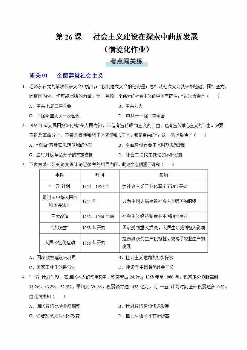 第26课 社会主义建设在探索中曲折发展(情境化作业)(原卷版)
