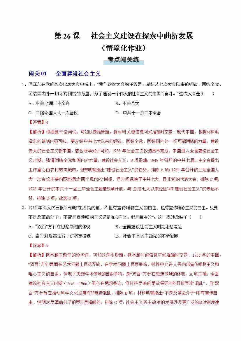 第26课 社会主义建设在探索中曲折发展(情境化作业)(解析版)