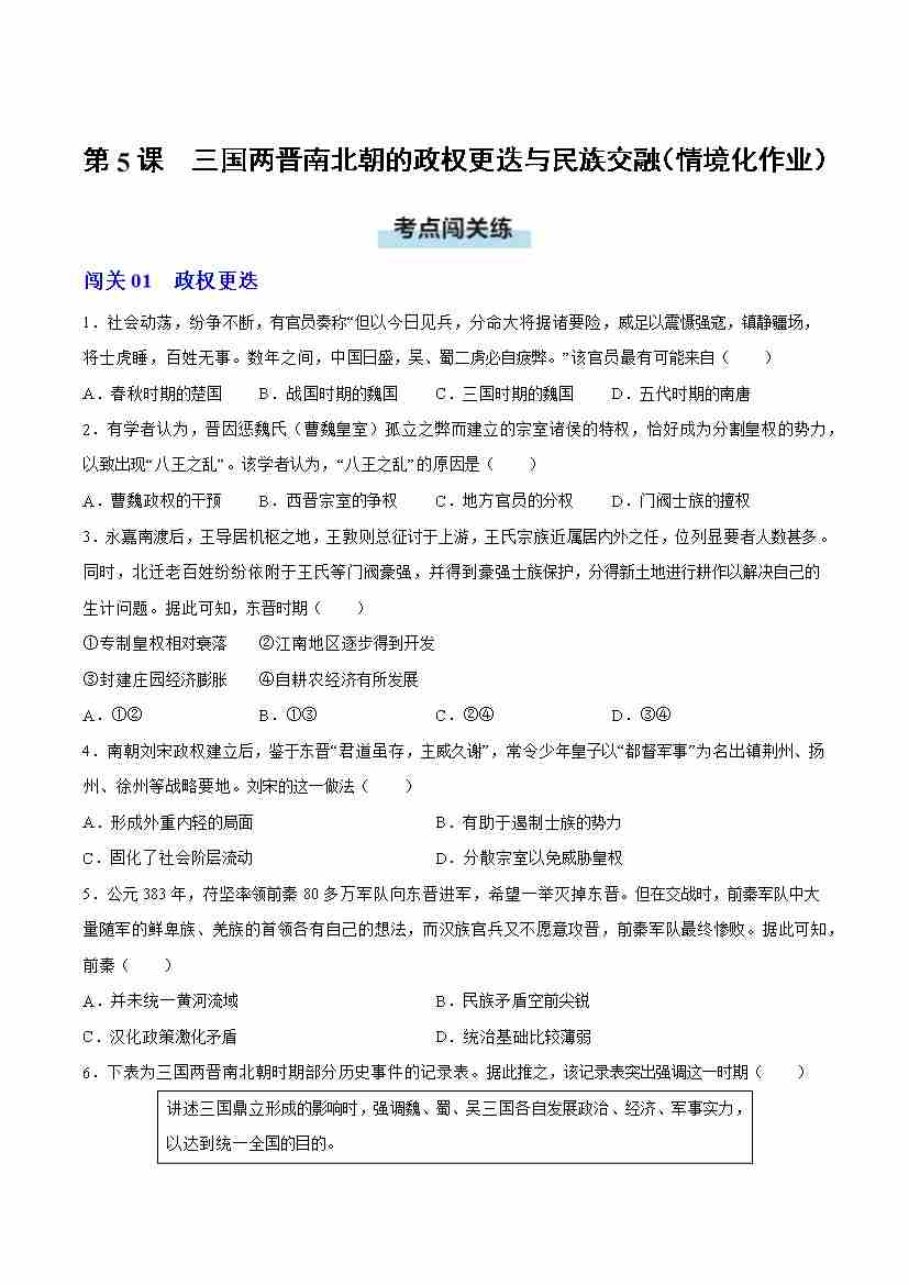 第5课 三国两晋南北朝的政权更迭与民族交融(情境化作业)(原卷版)