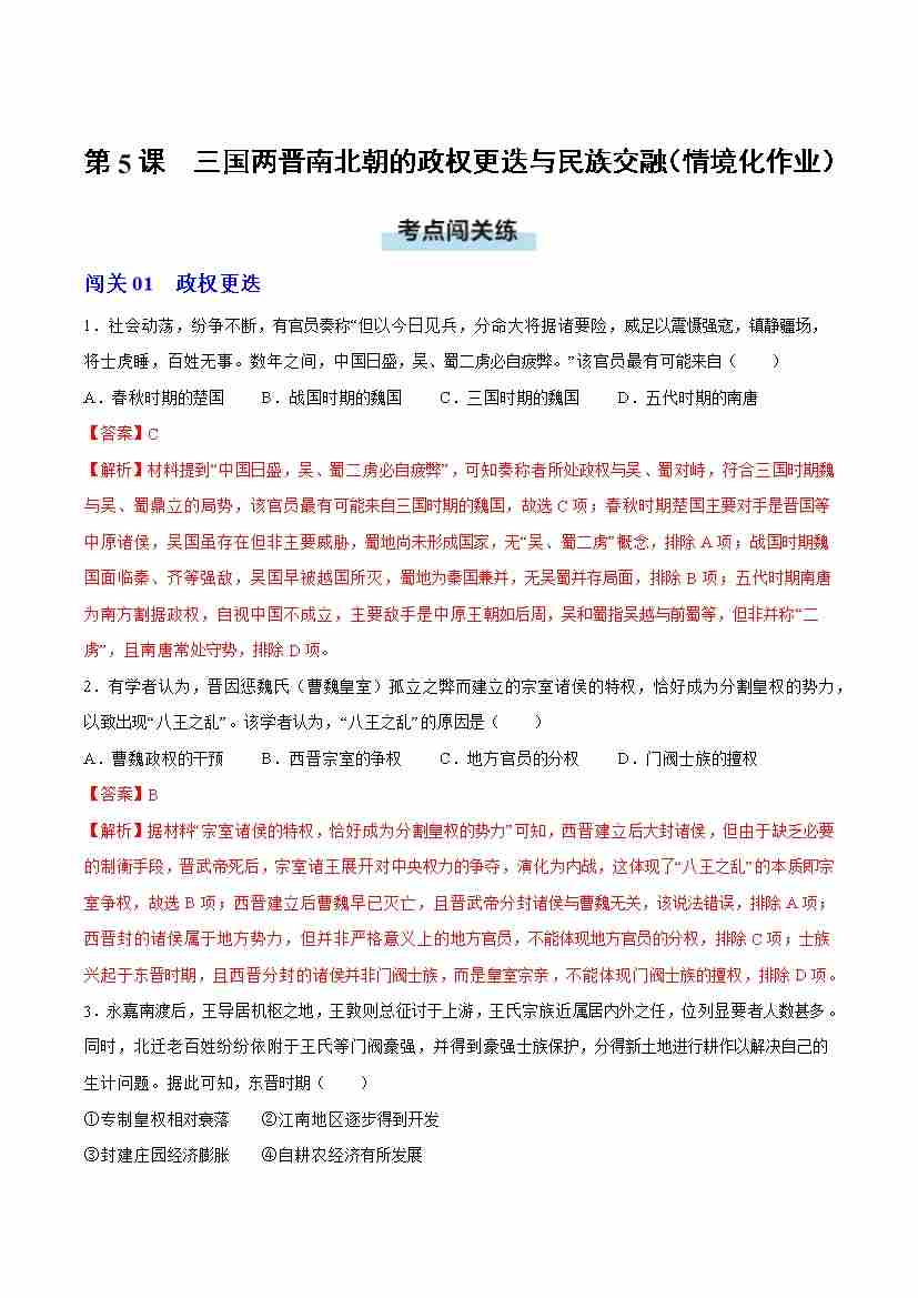 第5课 三国两晋南北朝的政权更迭与民族交融(情境化作业)(解析版)