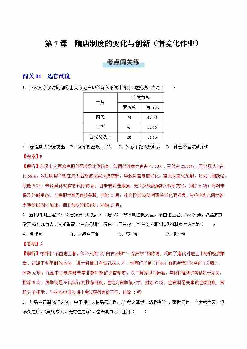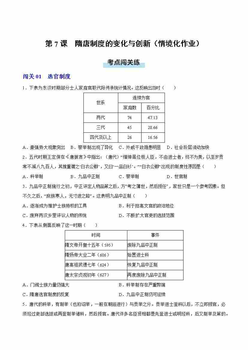 第7课 隋唐制度的变化与创新(情境化作业)(解析版)