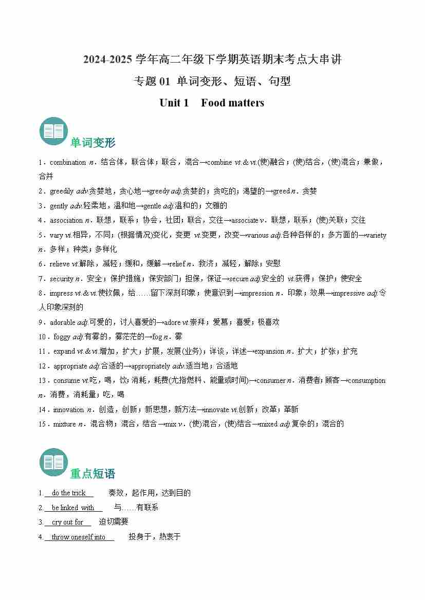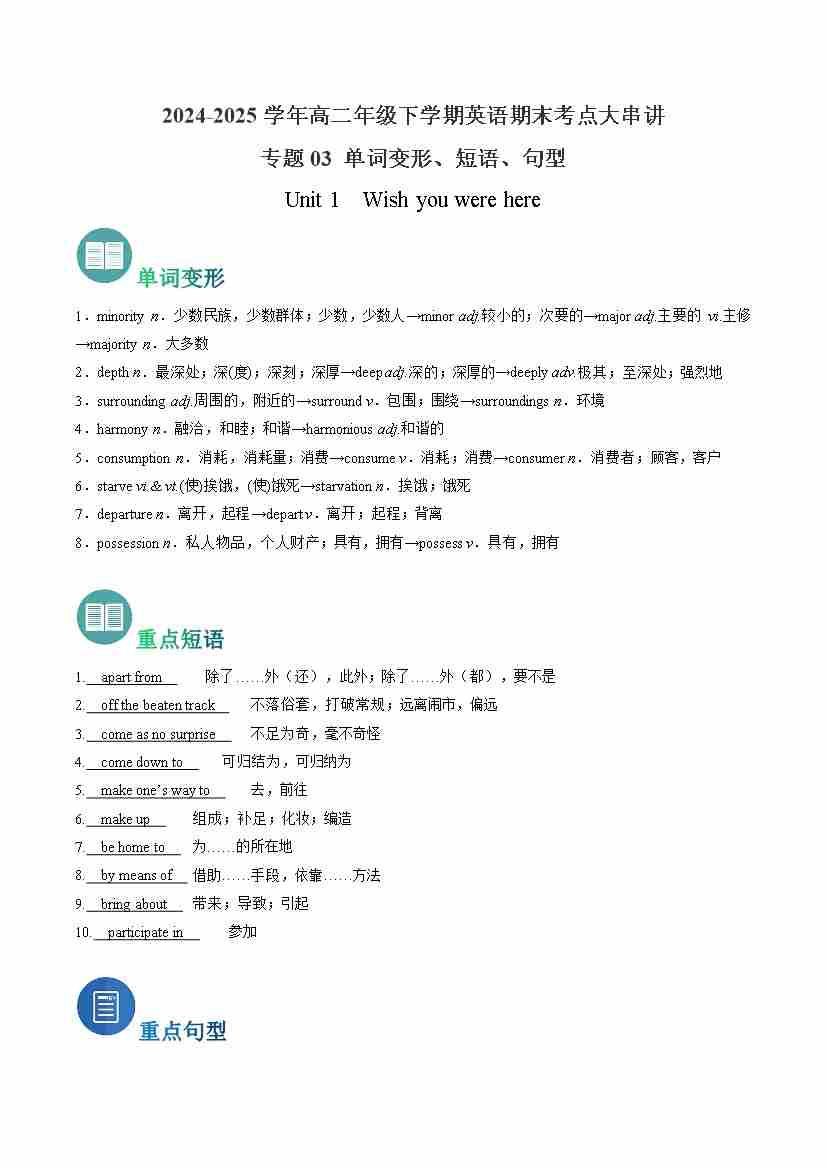 考点清单01 选择性必修一 Unit 1~Unit 4 (重点单词变形、短语、用法、句型)-(译林版2020)